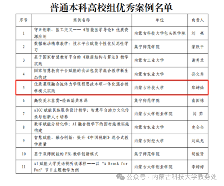 近日,内蒙古自治区教育厅公布《国家智慧教育平台应用优秀案例评选结果》,我校郑坤灿教授团队《优质慕课融合流体力学课程思政本硕一体化混合教学模式实践》成功入选普通本科高校组优秀案例,标志着我校在国家智慧教育平台深化应用、数字化教学创新与课程思政融合方面取得标志性成果。